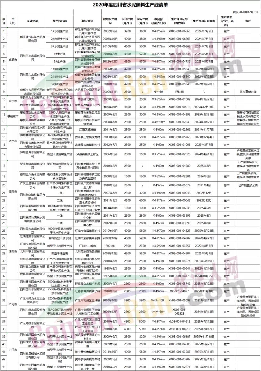 5月18日,四川省經(jīng)濟(jì)和信息化廳發(fā)布了《關(guān)于四川省水泥熟料和平板玻璃生產(chǎn)線清單的公示》,公示顯示,截止到2020年12月31日,四川省共有109條水泥熟料生產(chǎn)線,合計(jì)產(chǎn)能9921.93萬(wàn)噸,其中10條停產(chǎn),1條在建。