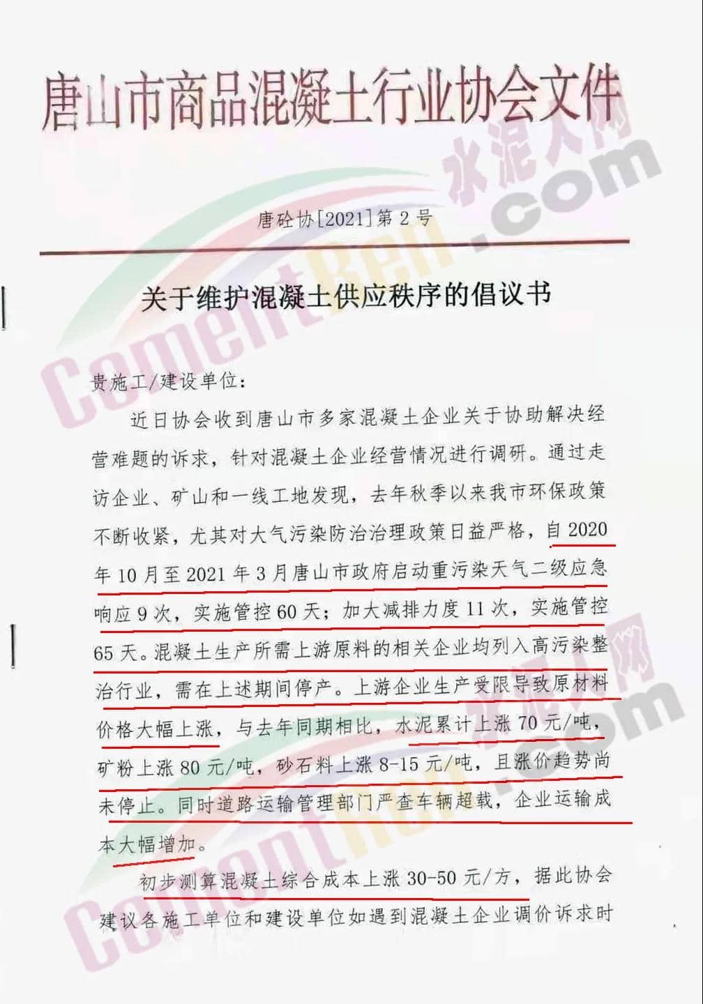 唐山市商品混凝土行業(yè)協(xié)會(huì)發(fā)布《關(guān)于維護(hù)混凝土供應(yīng)秩序的倡議書(shū)》給下游施工建設(shè)單位稱: