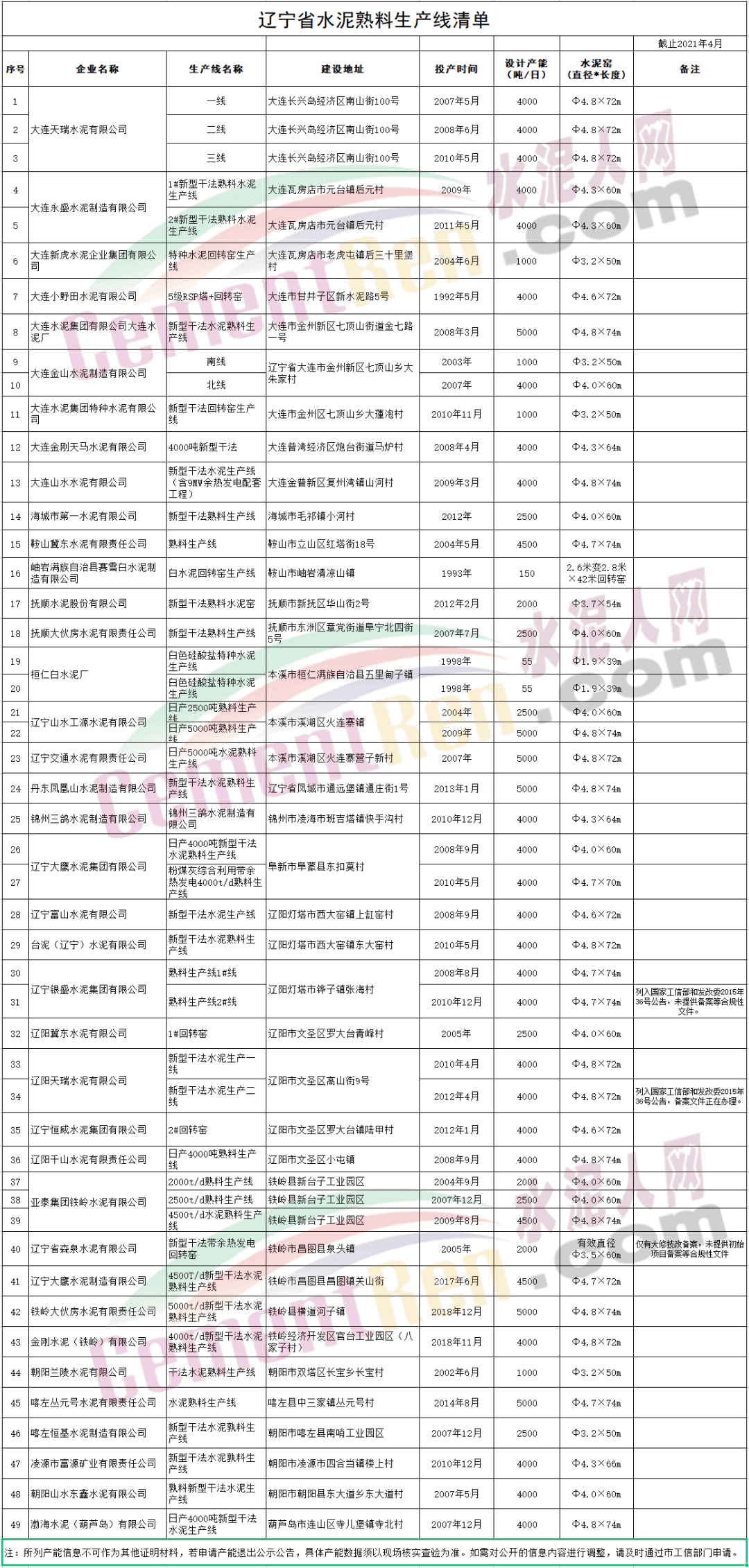 日前,遼寧省工業(yè)和信息化廳發(fā)布《遼寧省工業(yè)和信息化廳關(guān)于更新水泥熟料及平板玻璃生產(chǎn)線清單的公示》公示顯示,截止到2021年4日,遼寧省共有49條水泥熟料生產(chǎn)線,合計(jì)產(chǎn)能4942.8萬(wàn)噸。