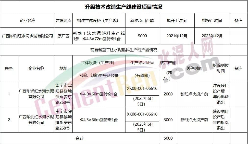 日前,廣西壯族自治區(qū)工業(yè)和信息化廳發(fā)布《關(guān)于廣西華潤紅水河水泥有限公司升級改造建設5000t/d水泥熟料生產(chǎn)線及協(xié)同處置項目產(chǎn)能情況的公示》稱,按照相關(guān)通知要求,將廣西華潤紅水河水泥有限公司升級改造建設5000t/d水泥熟料生產(chǎn)線及協(xié)同處置項目產(chǎn)能情況進行公示,具體公式如下: