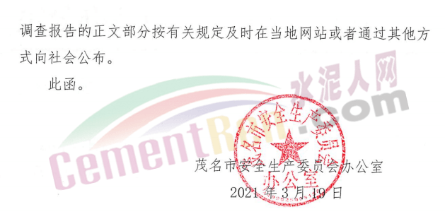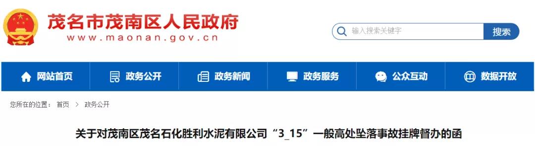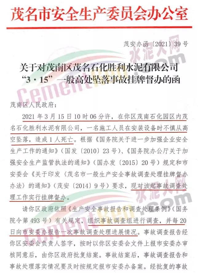 日前,廣東省茂名市茂南區(qū)人民政府發(fā)布《關于對茂南區(qū)茂名石化勝利水泥有限公司“3·15”一般高處墜落事故掛牌督辦的函》稱,根據相關通知要求,對茂南區(qū)茂名石化勝利水泥有限公司“3·15”一般高處墜落事故調查處理工作實行掛牌督辦。具體通知如下: