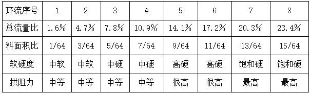 太極錐產(chǎn)生的整體流特征非常明顯:最外環(huán)部分硬度最高,垂直料重占比最大達(dá)23.4%,也是最先進(jìn)入太極錐的最大流量23.4%,前4級(jí)的底部最硬料部分合計(jì)高達(dá)75%流量,后4級(jí)的中硬料合計(jì)僅占25%流量,最中心部分的軟料只占1.6%,完全區(qū)別于氣動(dòng)卸放的中心漏斗軟料優(yōu)先方式,形成了典型的外快內(nèi)慢等差流量分布,而外圍硬料大料流自然形成了對(duì)庫(kù)壁及底部的自動(dòng)清理,根本沒(méi)有死料偏庫(kù)發(fā)生的機(jī)會(huì)。