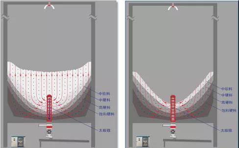 1.等壓氣源吹入庫(kù)底,低密度的空氣必然走軟不走硬,結(jié)果自然向中上軟料區(qū)匯聚發(fā)展,而不可能均勻滲透作用于邊壁硬料區(qū),造成料流速度的自然極化分離,最后必然在中部形成一個(gè)或多個(gè)漏斗流,而邊壁硬料越走越慢,直至停頓變?yōu)樗懒?,死料不斷增長(zhǎng)發(fā)展為偏庫(kù)情況。