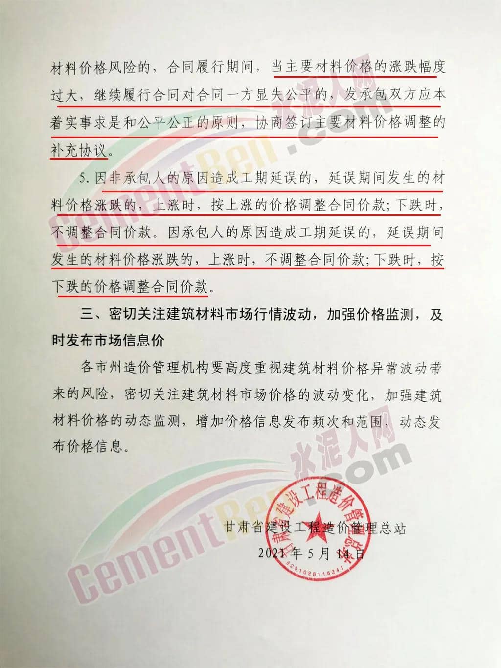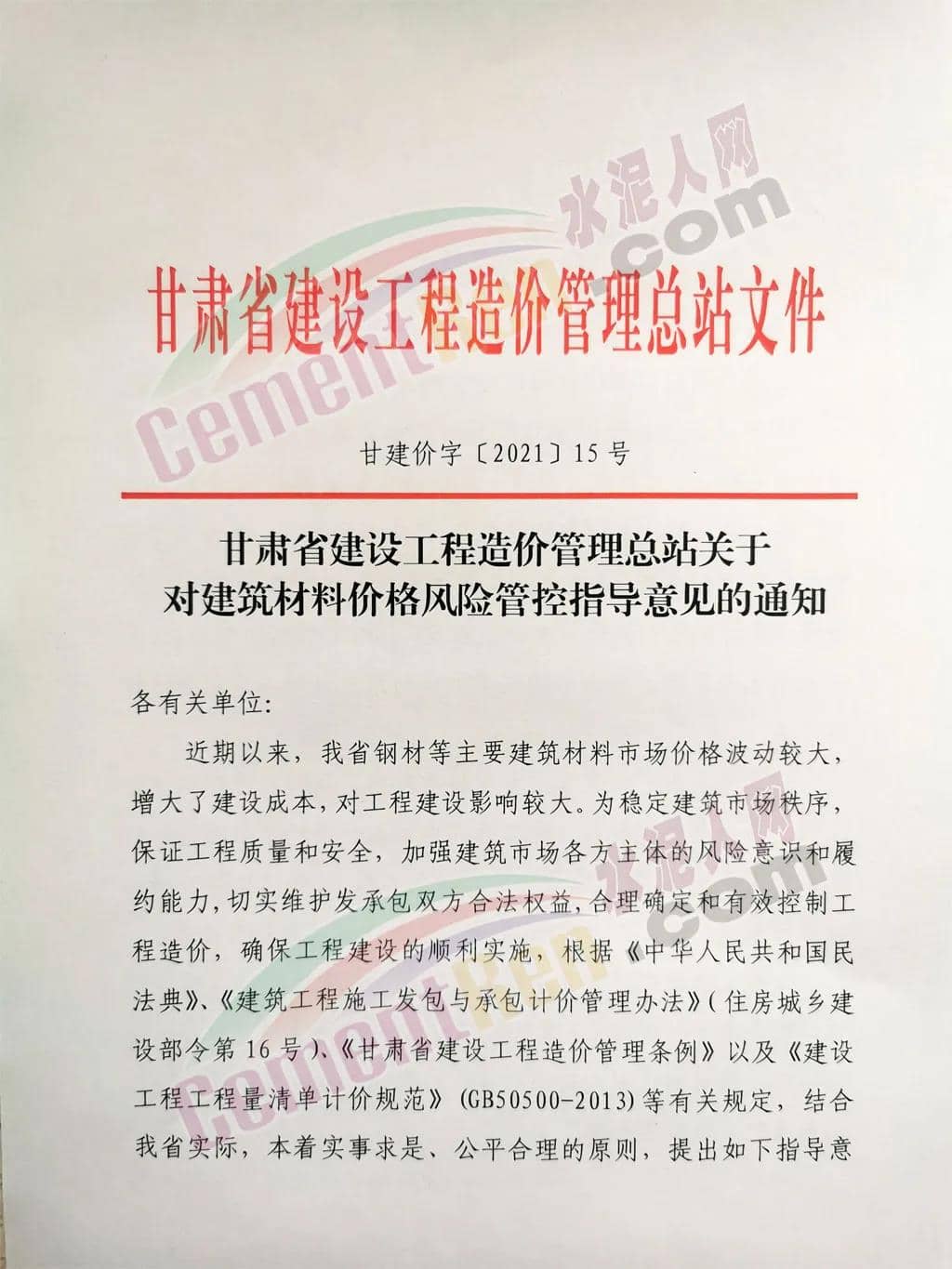 同期,甘肅省建設(shè)工程造價管理總站發(fā)布了關(guān)于對建筑材料價格風(fēng)險管控指導(dǎo)意見的通知(甘建價字〔2021〕15號),建議風(fēng)險幅度宜控制在5%以內(nèi)。