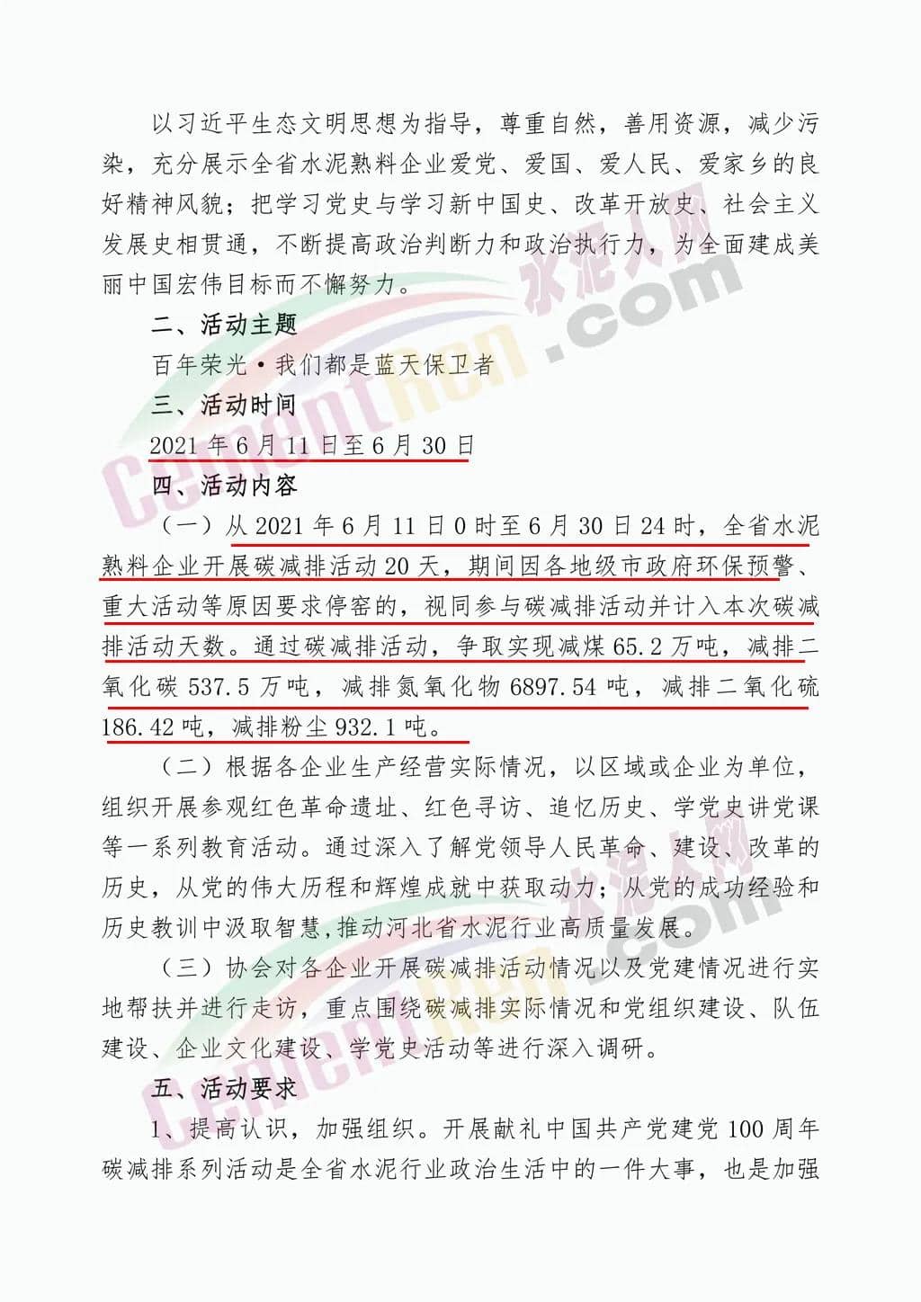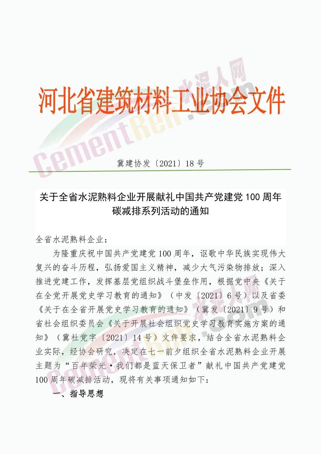 日前,河北省建筑材料工業(yè)協(xié)會(huì)發(fā)布《關(guān)于全省水泥熟料企業(yè)開展獻(xiàn)禮中國共產(chǎn)黨建黨100周年碳減排系列活動(dòng)的通知》給全省水泥熟料企業(yè)稱,依據(jù)相關(guān)文件要求,結(jié)合全省水泥熟料企業(yè)實(shí)際,經(jīng)研究決定在七一前夕組織全省水泥熟料企業(yè)開展獻(xiàn)禮中國共產(chǎn)黨建黨100周年碳減排活動(dòng)。