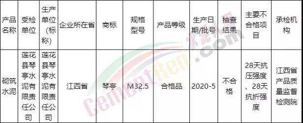 江西省市場(chǎng)監(jiān)督管理局發(fā)布監(jiān)督抽查結(jié)果顯示一個(gè)批次砌筑水泥28天抗壓強(qiáng)度、28天抗折強(qiáng)度不合格。產(chǎn)品生產(chǎn)單位標(biāo)稱(chēng)為蓮花縣琴亭水泥有限責(zé)任公司。