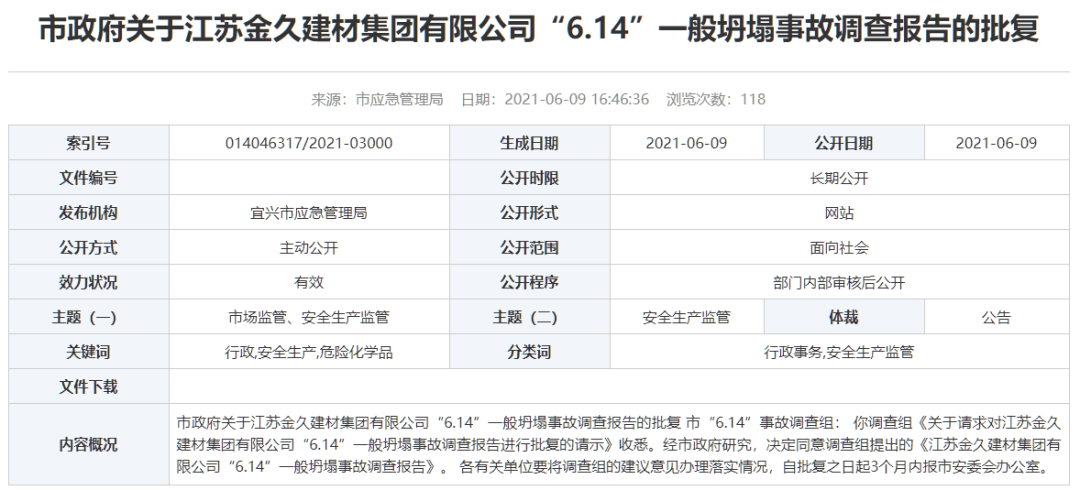 經(jīng)調(diào)查認(rèn)定,江蘇金久建材集團(tuán)有限公司“6.14”坍塌事故是一起一般生產(chǎn)安全責(zé)任事故。