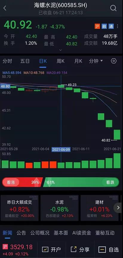 據(jù)水泥人網(wǎng)了解,昨日(6月21日)海螺水泥A股盤中股價最低觸及40.82元,連續(xù)8個交易日公司股價連續(xù)下挫,跌逾12%,創(chuàng)2019年9月以來新低。而2021年以來,海螺水泥累計跌幅達21.52%,市值蒸發(fā)437億 。