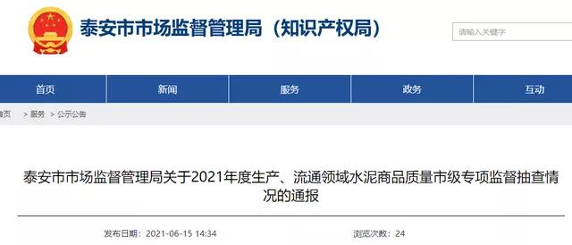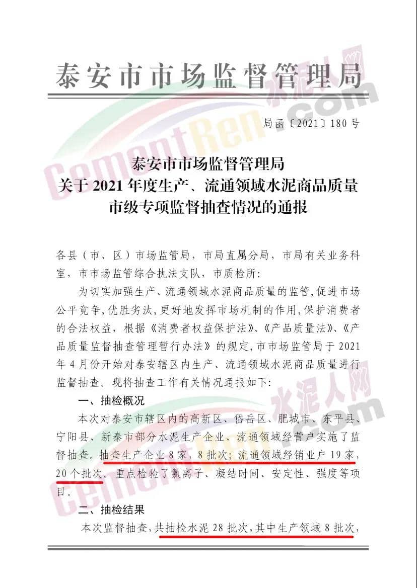 日前,山東省泰安市市場監(jiān)督管理局發(fā)布關于2021年度生產(chǎn)、流通領域水泥商品質(zhì)量市級專項監(jiān)督抽查情況的通報。