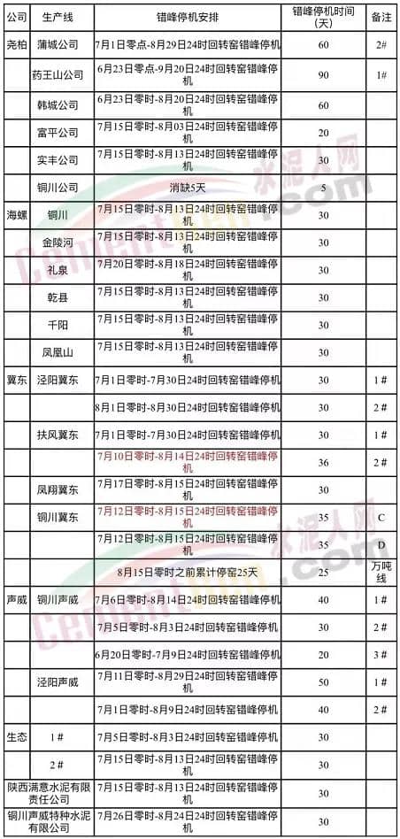 《通知》結(jié)合陜西省水泥行業(yè)運行規(guī)律和各企業(yè)實際情況制定了具體的“水泥熟料生產(chǎn)線錯峰生產(chǎn)計劃表”,要求關(guān)中地區(qū)堯柏、海螺、冀東、聲威等29條水泥熟料生產(chǎn)線自6月20日零時起安排錯峰停產(chǎn),最高停產(chǎn)90天。各企業(yè)要嚴(yán)格按照計劃執(zhí)行,無特殊情況,不得對計劃時間進(jìn)行調(diào)整。水泥人網(wǎng)注意到文件要求銅川冀東萬噸線于8月15日零時之前累計停窯25天。