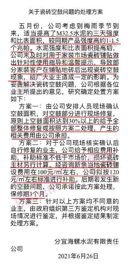 水泥強(qiáng)度和比表面積提高后,公司未及時對用于家裝市場瓷磚鋪貼做出針對性使用指導(dǎo)和溫馨提示,導(dǎo)致部分家裝客戶在鋪貼地磚后出現(xiàn)瓷磚空鼓現(xiàn)象,給廣大業(yè)主造成一定的影響。為妥善解決瓷磚空鼓問題,公司根據(jù)各位業(yè)主所提出的意見,研究確定處置方案如下∶