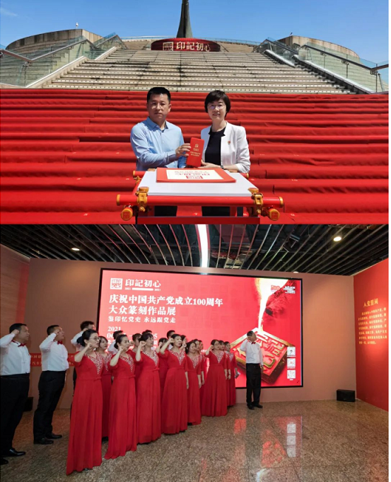健跑前夕,孫力實向中華世紀(jì)壇贈送了新材料印章,廣大黨員參觀中華世紀(jì)壇舉辦的“印記初心——慶祝中國共產(chǎn)黨成立100周年大眾篆刻作品展”,并開展重溫入黨誓詞活動。