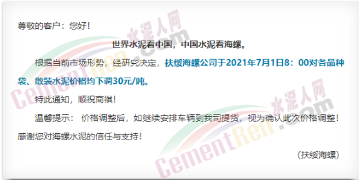 日前廣西扶綏海螺、興業(yè)海螺分別通知自即日起下調(diào)水泥價(jià)格10-30元/噸。