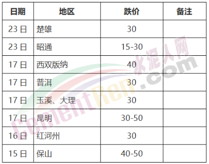 6月內(nèi),云南昆明、楚雄、昭通、西雙版納、普洱、玉溪、大理、紅河、保山等區(qū)域水泥價(jià)格回落,其中昆明由于市場需求疲軟,加之新增產(chǎn)能釋放沖擊市場,6月中旬前后,部分主流品牌水泥價(jià)格下跌30-50元/噸。