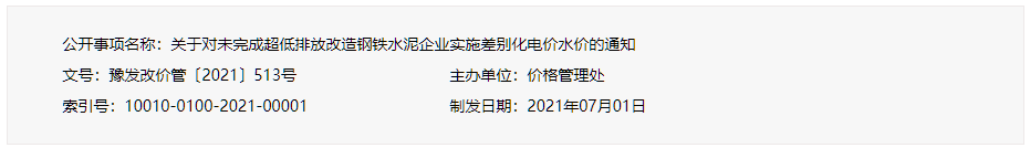 水泥企業(yè)實施差別化電價水價的通知》。根據(jù)通知,河南省發(fā)改委決定自2021年7月1日起,對河南昌泰不銹鋼板有限公司等83家有組織排放、無組織排放均不達標的企業(yè),用電加價0.03元/千瓦時、用水加價0.08元/立方米;對鄭州宇翔特種