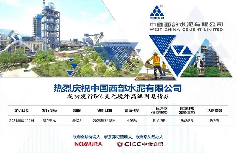 2021年6月29日,經(jīng)過(guò)2個(gè)月的緊張籌備,中國(guó)西部水泥有限公司成功確認(rèn)定價(jià),發(fā)行了6億美元境外高級(jí)固息債券,期限5年,利率4.95%。