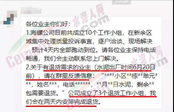 6月29日上午,海螺水泥相關(guān)負(fù)責(zé)人在業(yè)主群里發(fā)布消息稱,有退貨需求的業(yè)主,且水泥出廠時(shí)間在6月20日前的,可在群里反饋信息。公司已經(jīng)成立了3個(gè)退貨工作小組,會(huì)在兩天內(nèi)安排完成退貨。