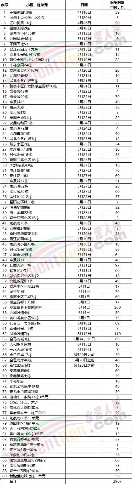據(jù)水泥人網(wǎng)不完全統(tǒng)計(jì),截止6月10日14時(shí),有約2967包(約148噸)水泥反饋需要退貨。生產(chǎn)日期從4月10日至6月20日之前均有,最多的退貨200包,最少的也有2包剩余需要退貨。涉及紫金麗都、袁河小區(qū)、御天城、印象地中海、壹方城、觀巢鎮(zhèn)鄉(xiāng)下彭家邊村、濕地風(fēng)情、虹西美廬、江山御景、香山聽泉等89戶業(yè)主詳細(xì)如下: