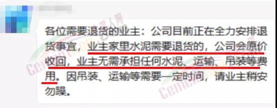 收到可以退貨的消息,業(yè)主群反饋信息陸續(xù)發(fā)出,且已有部分業(yè)主開始退貨。從視頻和退貨收款函內(nèi)容可見,退貨水泥為M32.5砌筑水泥。