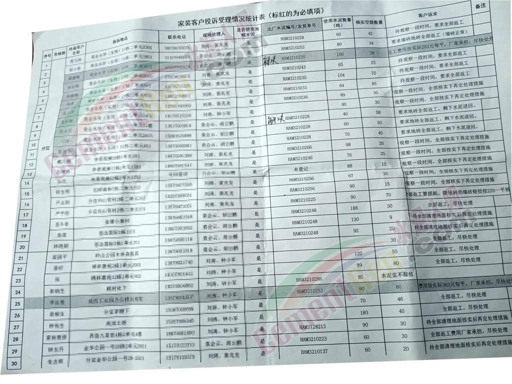 據(jù)不完全統(tǒng)計(jì),使用水泥數(shù)量達(dá)2570噸,客戶訴求為部分或全部返工,剩余水泥退回。也有業(yè)主訴求觀察一段時(shí)間,再核實(shí)定下步處理措施。個(gè)別業(yè)主要自行處理,其費(fèi)用分別為283元/平方、363元/平方由廠家承擔(dān)。