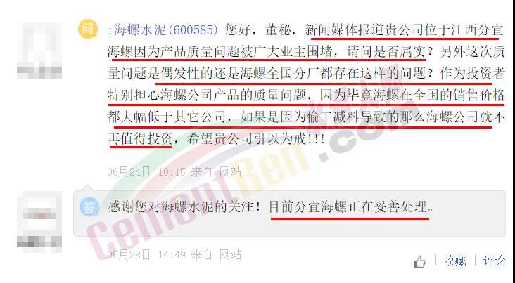 日前,有投資者在上證e互動(dòng)平臺(tái)向海螺水泥提問稱,新聞媒體報(bào)道貴公司位于江西分宜海螺因?yàn)楫a(chǎn)品質(zhì)量問題被廣大業(yè)主圍堵,是否屬實(shí)?這次質(zhì)量問題是偶發(fā)性的還是海螺全國分廠都存在這樣的問題?作為投資者特別擔(dān)心海螺公司產(chǎn)品的質(zhì)量問題,因?yàn)楫吘购B菰谌珖匿N售價(jià)格都大幅低于其它公司,如果是因?yàn)橥倒p料導(dǎo)致的那么海螺公司就不再值得投資。海螺水泥上市公司回復(fù)稱,目前分宜海螺正在妥善處理。