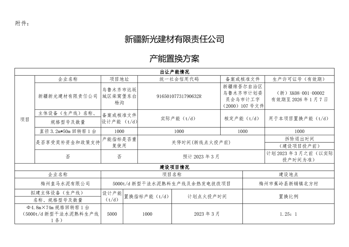 按照《國務院辦公廳關于促進建材工業(yè)穩(wěn)增長調(diào)結構增效益的指導意見》(國辦發(fā)〔2016〕34號)、《工業(yè)和信息化部關于印發(fā)鋼鐵水泥玻璃行業(yè)產(chǎn)能置換實施辦法的通知》(工信部原〔2017〕337號)、《工業(yè)和信息化部辦公廳國家發(fā)展改革委辦公廳關于嚴肅產(chǎn)能置換嚴禁水泥平板玻璃行業(yè)新增產(chǎn)能的通知》(工信廳聯(lián)原〔2018〕57號)、《水泥玻璃行業(yè)產(chǎn)能置換實施辦法操作問答》要求,新疆維吾爾自治區(qū)工信廳于2021年6月1日至6月9日對《新疆新光建材有限責任公司產(chǎn)能置換方案》進行了公示,公示期間異議問題已得到處理?,F(xiàn)將《新疆新光建材有限責任公司產(chǎn)能置換方案》予以公告,置換項目的生產(chǎn)線在新建項目投產(chǎn)前需完成拆除。