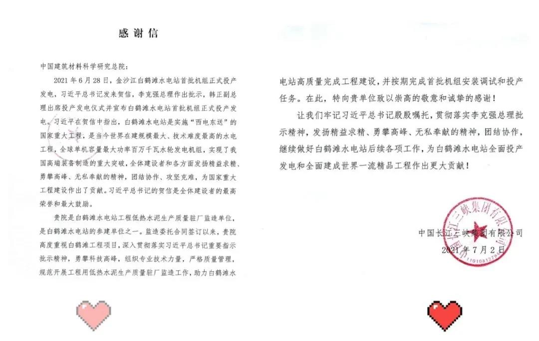7月5日,中國建材集團(tuán)所屬中國建筑材料科學(xué)研究總院有限公司(以下簡稱“中國建材總院”)和嘉華特種水泥股份有限公司(以下簡稱“嘉華水泥”),分別收到了來自白鶴灘水電站開發(fā)建設(shè)方中國長江三峽集團(tuán)有限公司的感謝信。