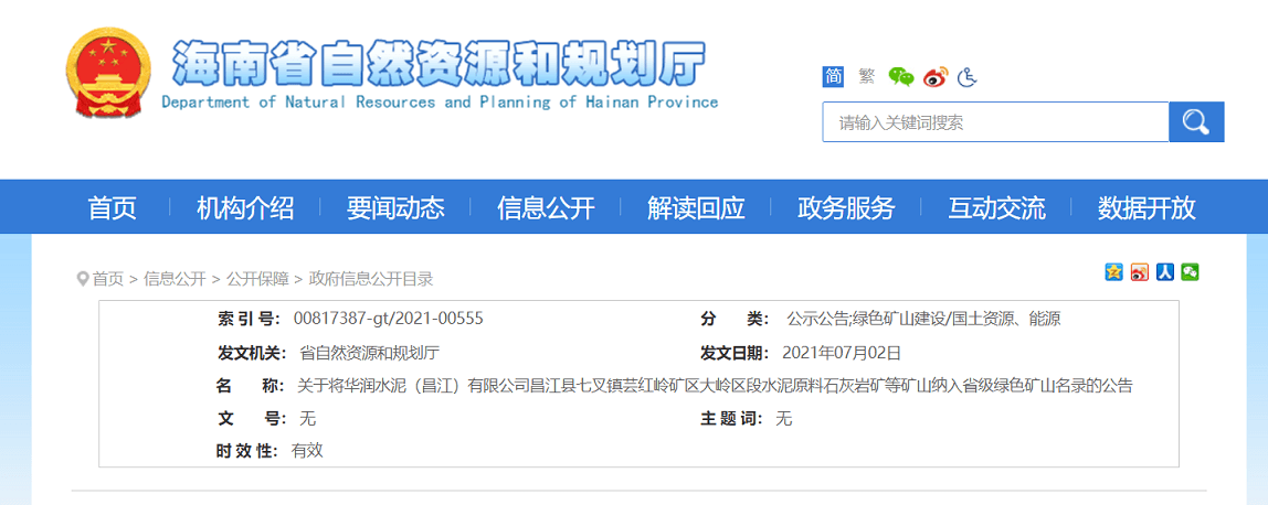華潤水泥一石灰?guī)r礦山納入省級綠色礦山!