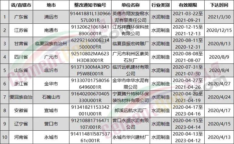 日前,水泥人網(wǎng)從生態(tài)環(huán)境部全國排污許可證管理信息平臺(tái)了解到,近兩年有多家水泥行業(yè)企業(yè)被要求限期限整改。
