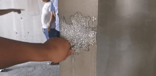 近日,陜西省渭南市蒲城縣西豐文苑小區(qū)3號(hào)樓、5號(hào)樓正交房,不少業(yè)主卻發(fā)現(xiàn),新房隔墻卻是用泡沫和著水泥制成的,有業(yè)主砸開部分隔墻后,斷茬處用手能摳下泡沫顆粒,擔(dān)憂不安全。
