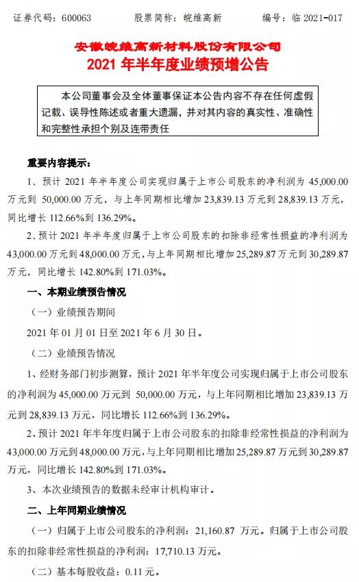 7月7日,皖維高新(600063)發(fā)布2021年半年度業(yè)績(jī)預(yù)告:預(yù)計(jì)2021年半年度公司實(shí)現(xiàn)歸屬于上市公司股東的凈利潤(rùn)為4.5億元到5億元,與上年同期相比增加2.3億元到2.8億元,同比增長(zhǎng)112.66%到136.29%。