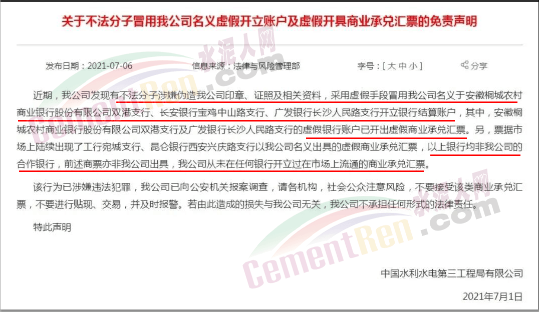 日前,中國水利水電第三工程局有限公司發(fā)布《關(guān)于不法分子冒用我公司名義虛假開立賬戶及虛假開具商業(yè)承兌匯票的免責(zé)聲明》稱,近期公司發(fā)現(xiàn)有不法分子涉嫌偽造中國水利水電第三工程局有限公司印章、證照及相關(guān)資料,采用虛假手段冒用中國水利水電第三工程局有限公司名義于開立銀行結(jié)算賬戶。并有部分虛假銀行賬戶已開出虛假商業(yè)承兌匯票。且公司從未在任何銀行開立過在市場上流通的商業(yè)承兌匯票。