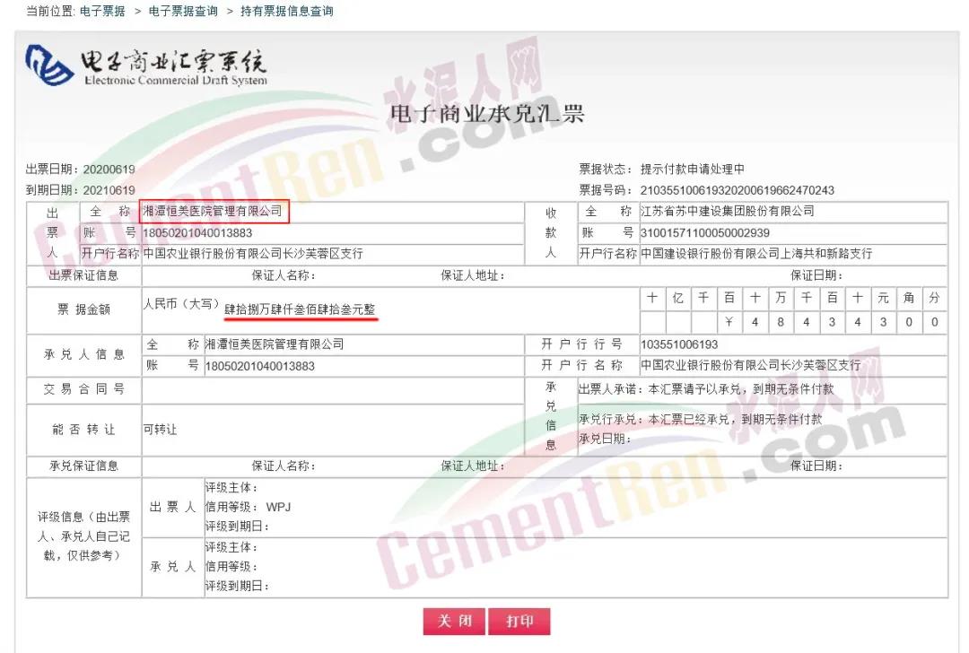 2021年6月19日,湘潭恒美醫(yī)院管理有限公司向江蘇省蘇中建設(shè)集團股份有限公司開出的一張一年期48.4萬元商業(yè)承兌匯票到期,債務(wù)人仍未付款,票據(jù)被申請付款處理中。