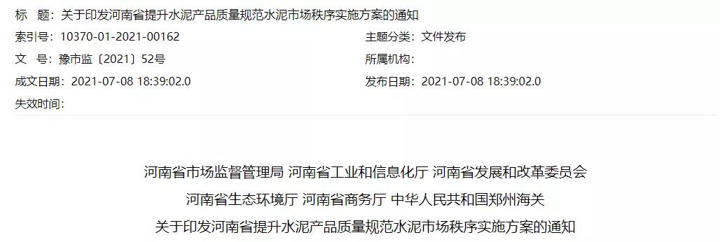 日前,河南省市場監(jiān)管總局、工業(yè)和信息化部、國家發(fā)展改革委、生態(tài)環(huán)境部、商務(wù)部、海關(guān)總署和國家知識產(chǎn)權(quán)局聯(lián)合印發(fā)了《關(guān)于印發(fā)河南省提升水泥產(chǎn)品質(zhì)量規(guī)范水泥市場秩序?qū)嵤┓桨傅耐ㄖ罚ㄏ潞喎Q“《通知》”)。