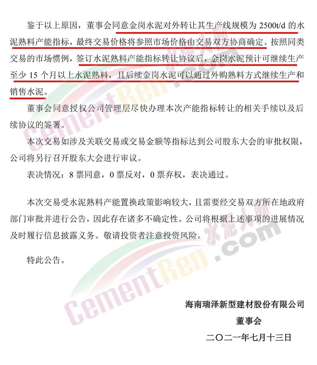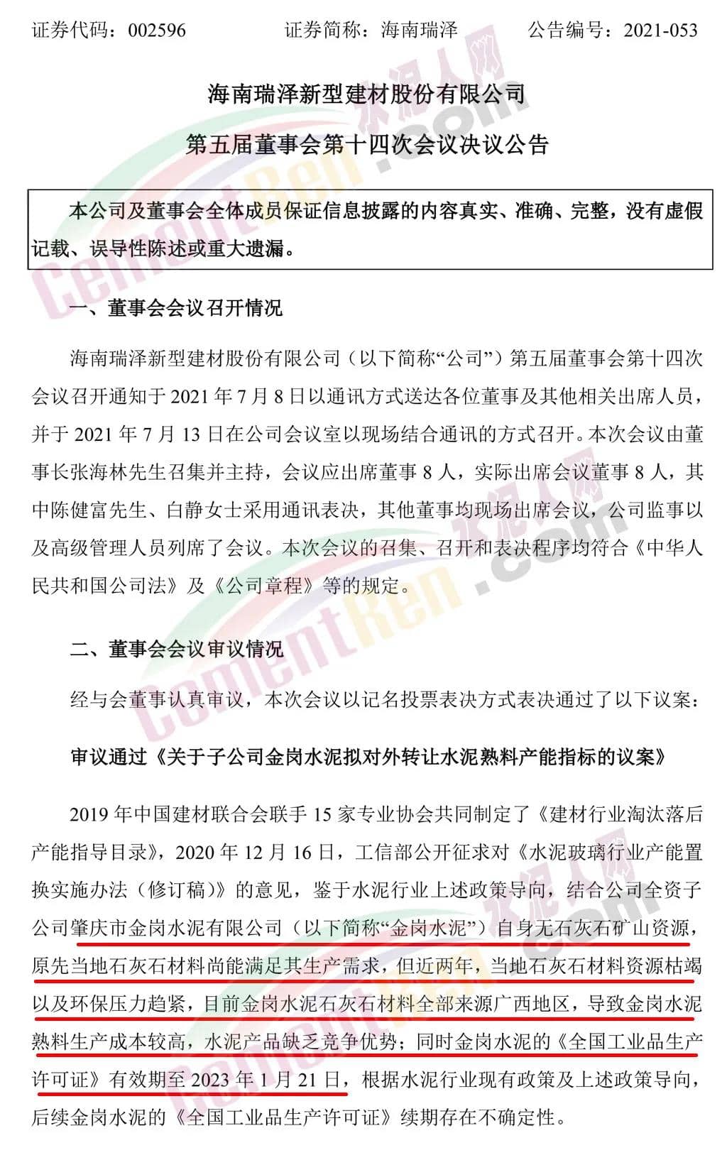 海南瑞澤新型建材股份有限公司上市公司發(fā)布第五屆董事會第十四次會議決議公告提到,鑒于水泥行業(yè)政策導(dǎo)向,結(jié)合公司全資子公司肇慶市金崗水泥有限公司(以下簡稱“金崗水泥”)自身無石灰石礦山資源,原先當(dāng)?shù)厥沂牧仙心軡M足其生產(chǎn)需求,但近兩年,當(dāng)?shù)厥沂牧腺Y源枯竭以及環(huán)保壓力趨緊,目前金崗水泥石灰石材料全部來源廣西地區(qū),導(dǎo)致金崗水泥熟料生產(chǎn)成本較高,水泥產(chǎn)品缺乏競爭優(yōu)勢;