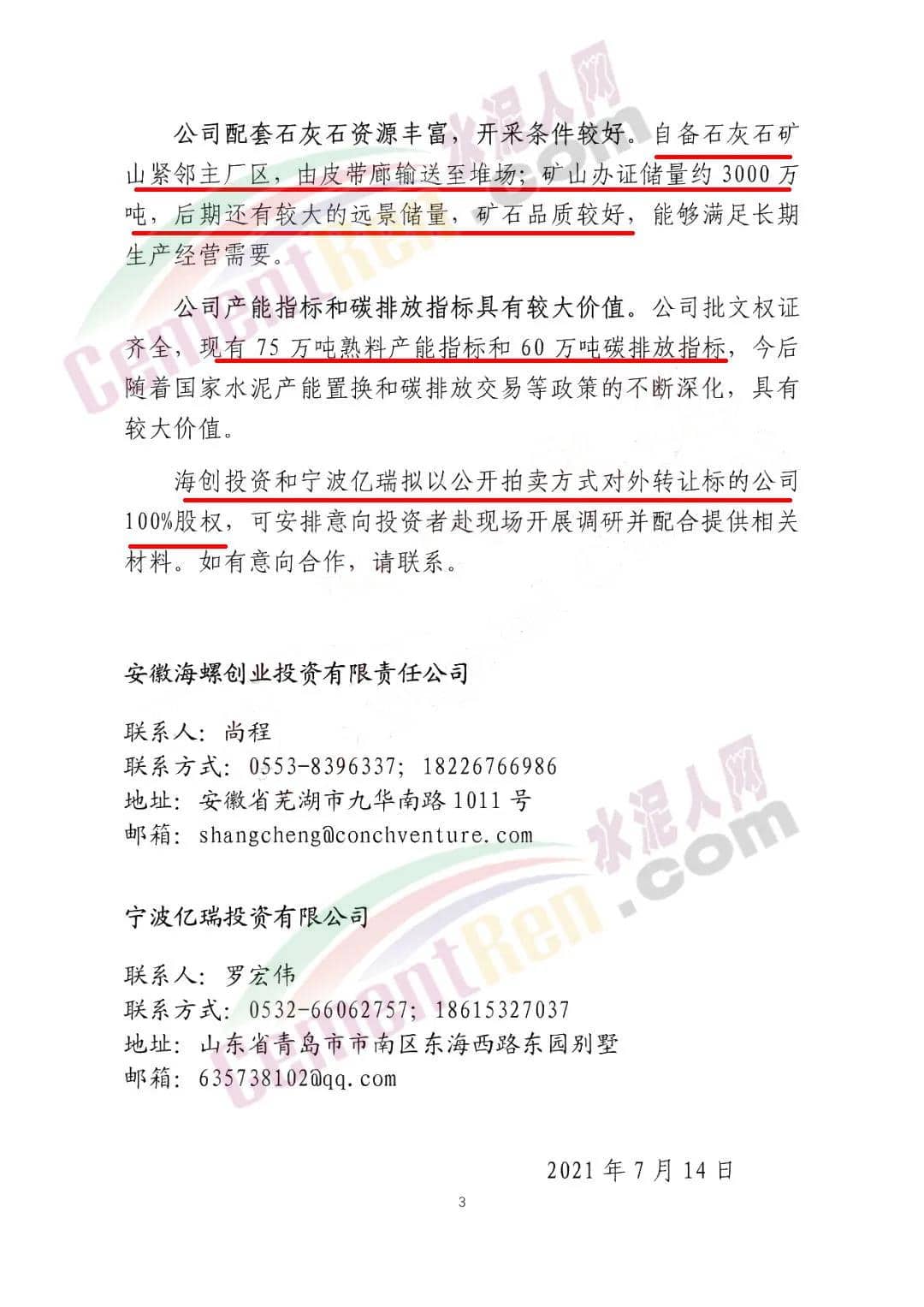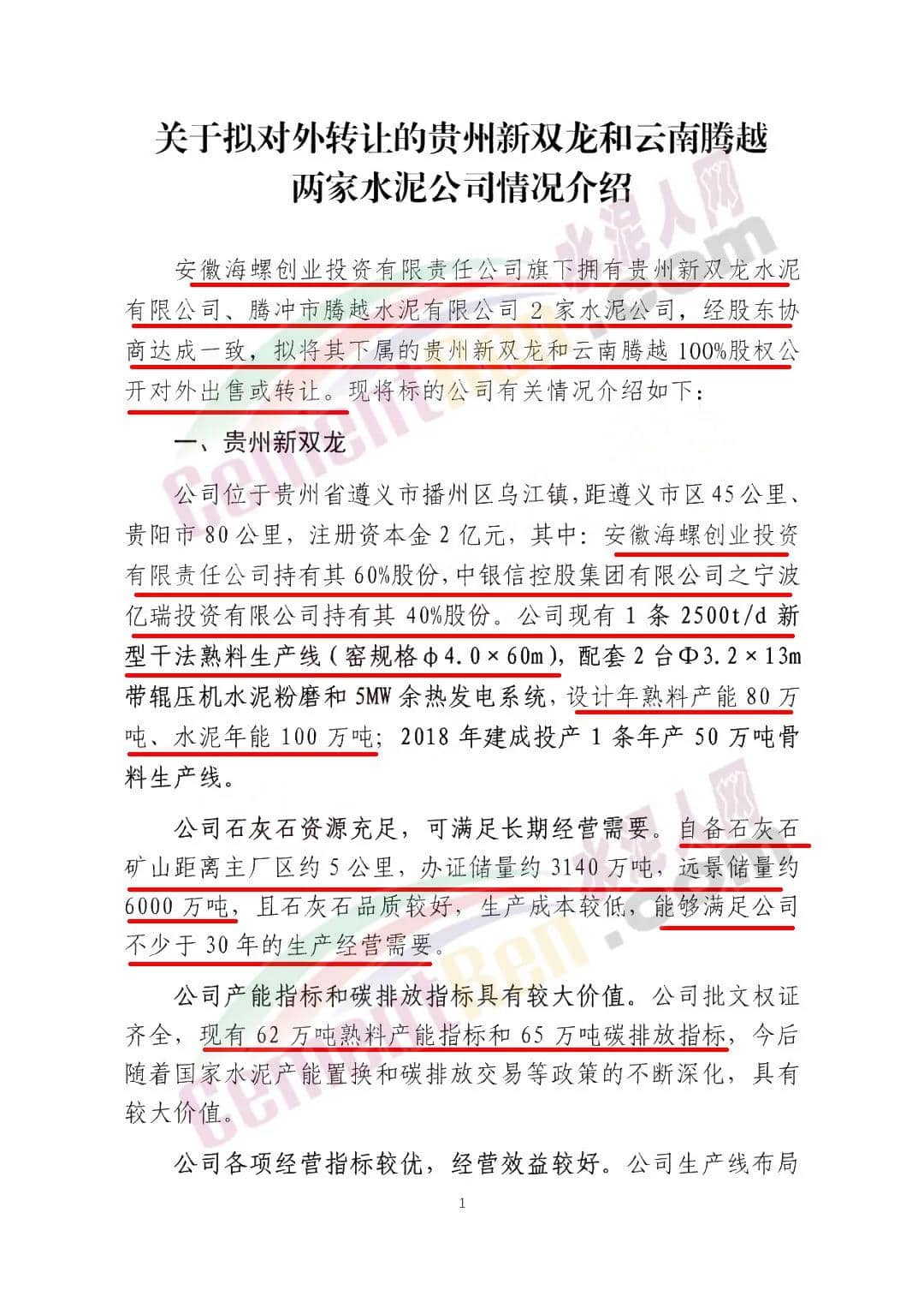 《情況介紹》提到安徽海螺創(chuàng)業(yè)投資有限責(zé)任公司旗下?lián)碛匈F州新雙龍水泥有限公司、騰沖市騰越水泥有限公司2家水泥公司,經(jīng)股東協(xié)商達成一致,擬將其下屬的貴州新雙龍和云南騰越100%股權(quán)公開對外出售或轉(zhuǎn)讓。