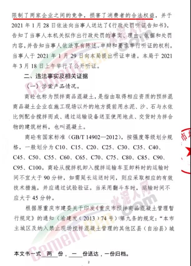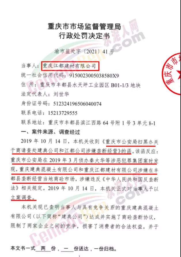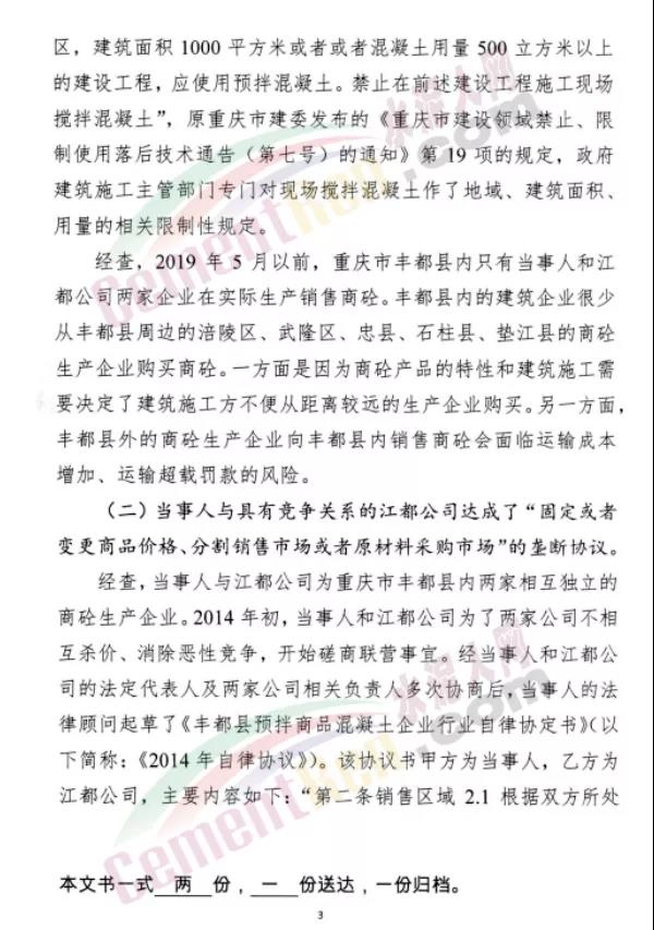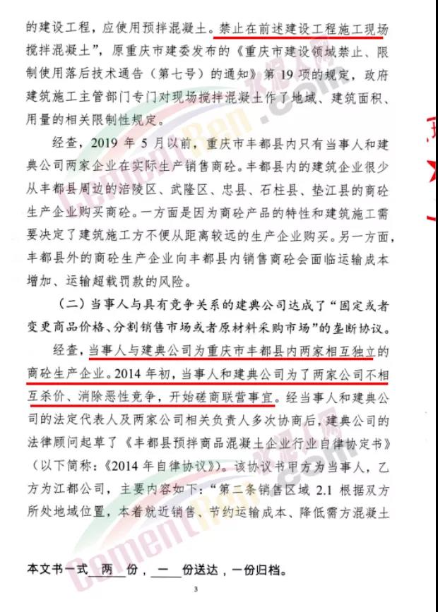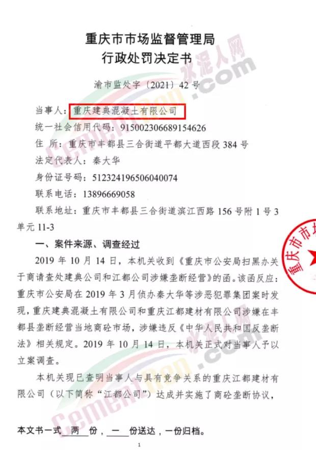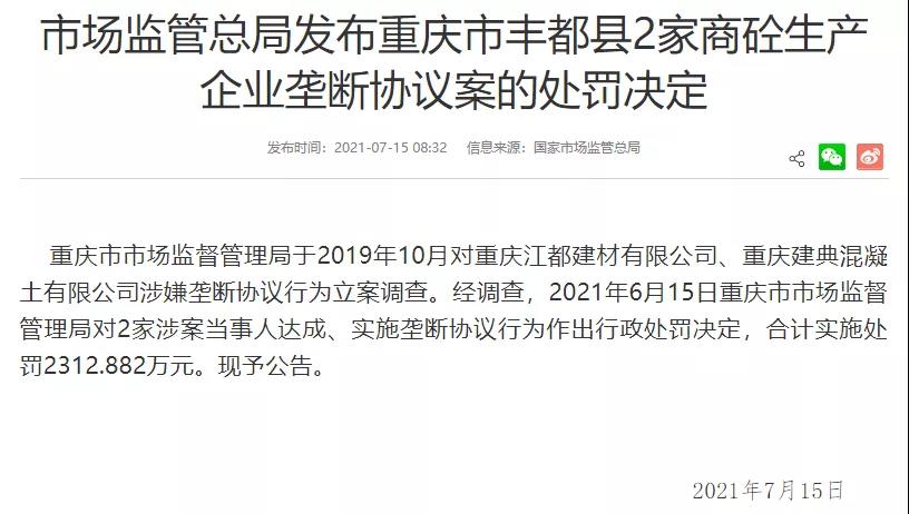 7月15日市場監(jiān)管總局發(fā)布重慶市豐都縣2家商砼生產(chǎn)企業(yè)壟斷協(xié)議案的處罰決定稱,重慶市市場監(jiān)督管理局于2019年10月對(duì)重慶江都建材有限公司、重慶建典混凝土有限公司涉嫌壟斷協(xié)議行為立案調(diào)查。經(jīng)調(diào)查,2021年6月15日重慶市市場監(jiān)督管理局對(duì)2家涉案當(dāng)事人達(dá)成、實(shí)施壟斷協(xié)議行為作出行政處罰決定,合計(jì)實(shí)施處罰2312.882萬元。