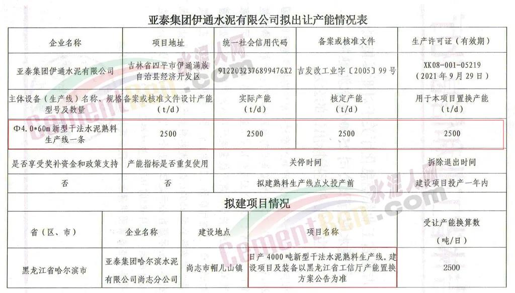 按照《國(guó)務(wù)院關(guān)于化解產(chǎn)能嚴(yán)重過(guò)剩矛盾的指導(dǎo)意見(jiàn)》(國(guó)發(fā)〔2013〕41號(hào))、《工業(yè)和信息化部水泥玻璃行業(yè)產(chǎn)能置換實(shí)施辦法》(工信部原〔2017〕337號(hào))、《工業(yè)和信息化部辦公廳國(guó)家發(fā)展改革委辦公廳關(guān)于嚴(yán)肅產(chǎn)能置換嚴(yán)禁水泥平板玻璃行業(yè)新增產(chǎn)能的通知》(工信廳聯(lián)原〔2018〕57號(hào))的要求,現(xiàn)將亞泰集團(tuán)伊通水泥有限公司2500t/d水泥熟料生產(chǎn)線產(chǎn)能指標(biāo)出讓情況予以公示,公示期自公示之日起五個(gè)工作日,請(qǐng)廣大社會(huì)公眾監(jiān)督。
