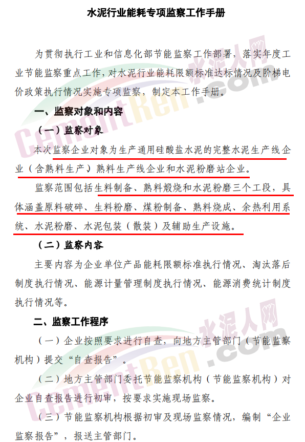 監(jiān)察范圍包括生料制備、熟料煅燒和水泥粉磨三個(gè)工段,具體涵蓋原料破碎、生料粉磨、煤粉制備、熟料燒成、余熱利用系統(tǒng)、水泥粉磨、水泥包裝(散裝)及輔助生產(chǎn)設(shè)施。