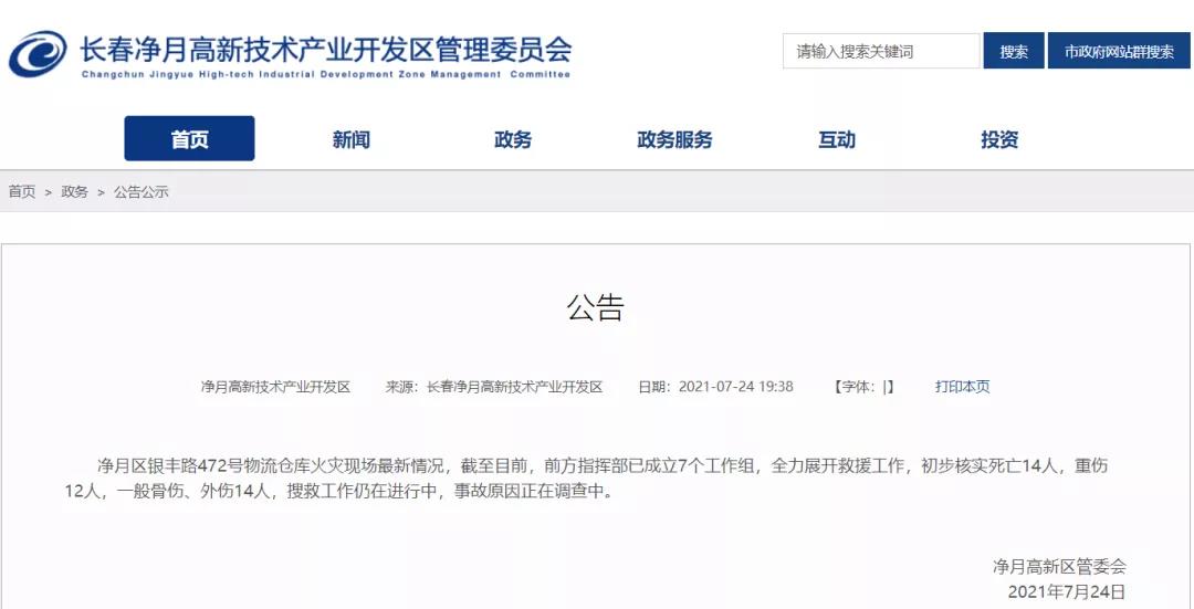 記者從長春凈月高新技術產(chǎn)業(yè)開發(fā)區(qū)了解到,該區(qū)一物流倉庫24日下午發(fā)生火災。截至記者發(fā)稿時,初步核實死亡14人,重傷12人,一般骨傷、外傷14人,搜救工作仍在進行中,事故原因正在調(diào)查中。