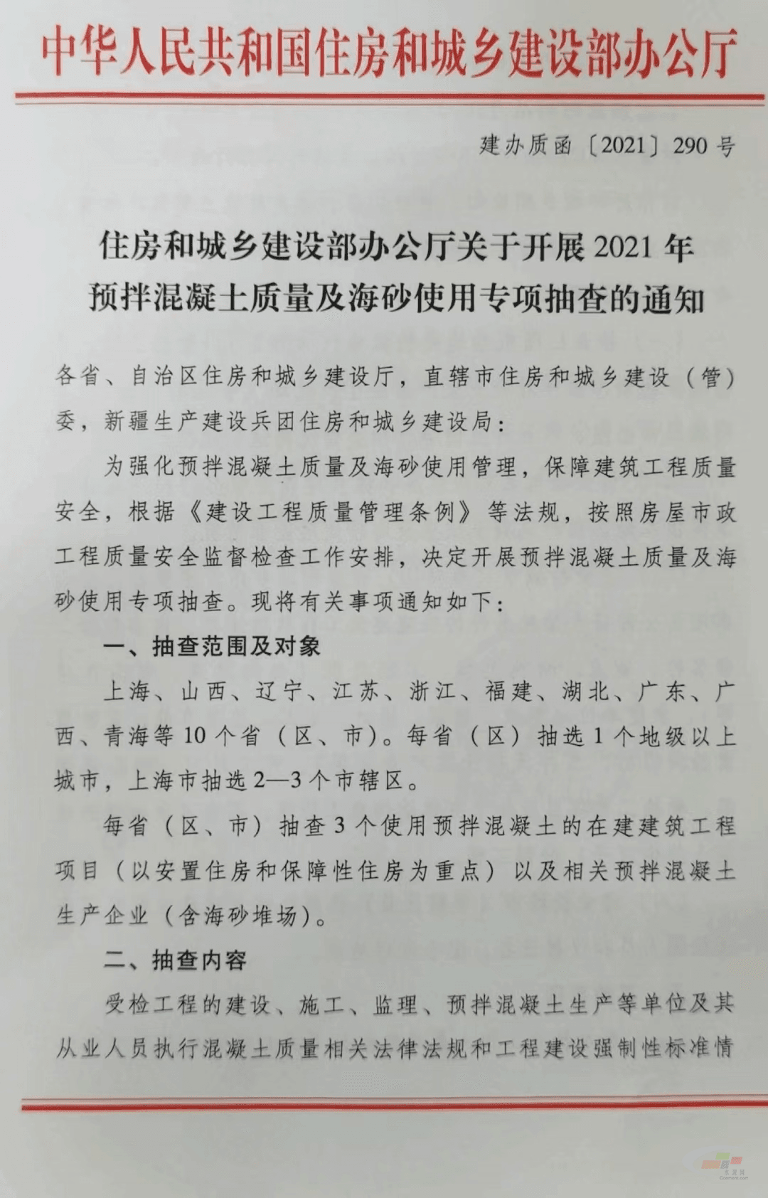 近日,住建部發(fā)布關(guān)于開(kāi)展2021預(yù)拌混凝土質(zhì)量及海砂使用專項(xiàng)檢查通知。
