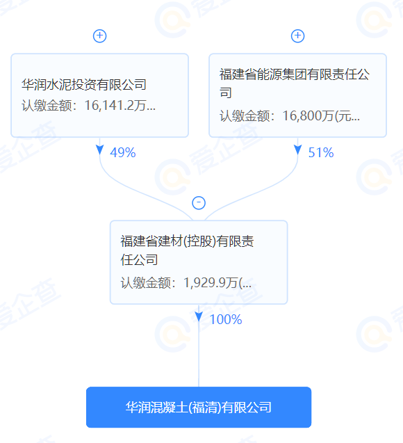 據(jù)查詢,華潤(rùn)混凝土(福清)有限公司為福建省建材(控股)有限公司100%控股子公司,為福建省能源集團(tuán)有限責(zé)任公司和華潤(rùn)水泥投資有限公司間接股權(quán)公司。