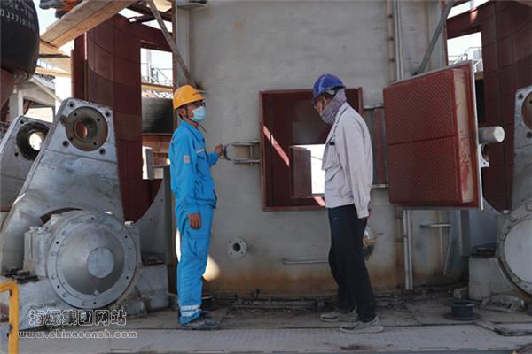 錢宣紅(左一)與監(jiān)理檢查原料磨安裝質(zhì)量