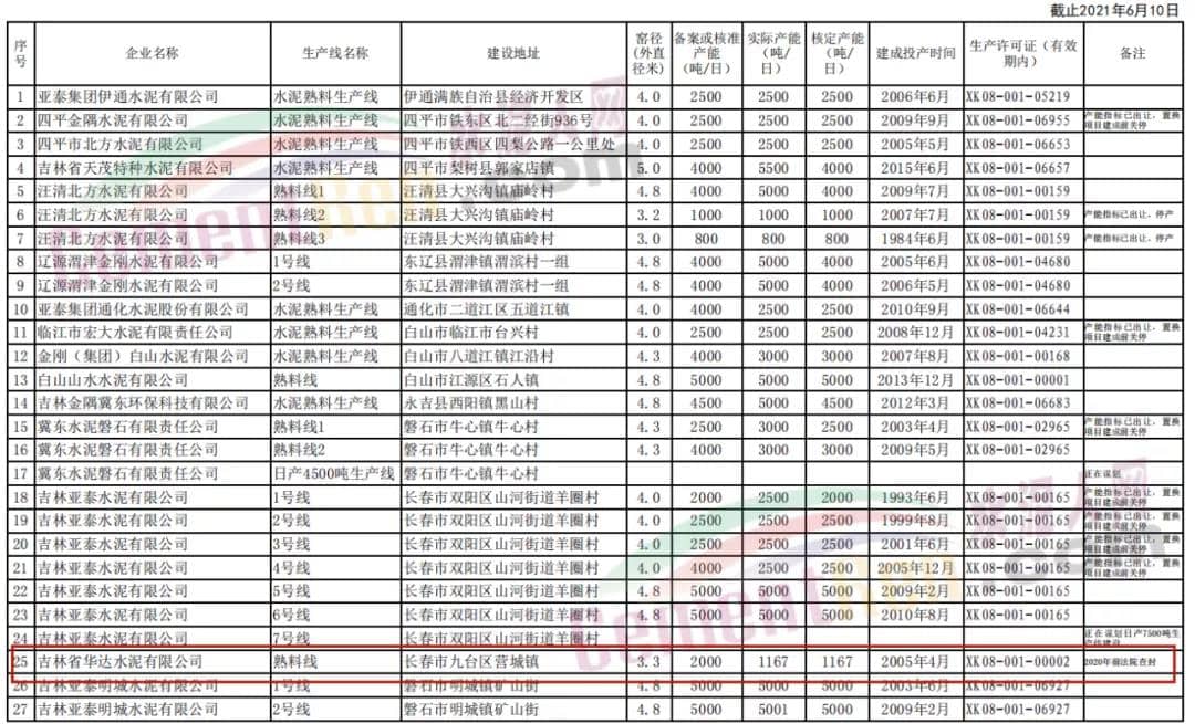 但是,根據(jù)吉林省工信廳發(fā)布的吉林省水泥熟料生產(chǎn)線清單顯示,吉林省華達(dá)水泥早在2020年前就被法院查封,一直沒(méi)生產(chǎn)的生產(chǎn)線出讓了1167t/d產(chǎn)能,典型的僵尸“復(fù)活”。