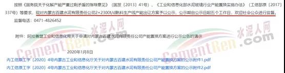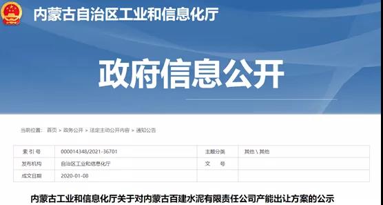 2020年1月8日,內(nèi)蒙古自治區(qū)工信廳發(fā)布公示將內(nèi)蒙古百建水泥有限責(zé)任公司2×2300t/d熟料生產(chǎn)線產(chǎn)能出讓至廣西桂民投珍珠水泥有限公司。
