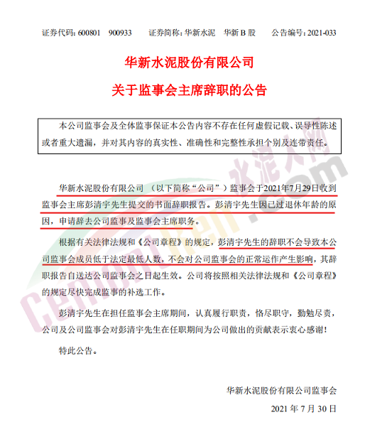 華新水泥7月29日晚間公告《關(guān)于監(jiān)事會辭職的公告》稱,公司監(jiān)事會于2021年7月29日收到監(jiān)事會主席彭清宇先生提交的書面辭職報告。彭清宇先生因已過退休年齡的原因,申請辭去公司監(jiān)事及監(jiān)事會主席職務(wù)。
