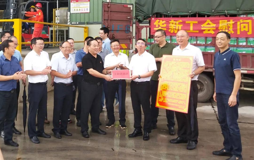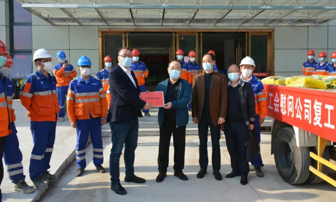 △席彭清宇(右四)為復(fù)工單位送慰問物資