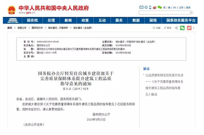 2019年國務(wù)院辦公廳發(fā)布了關(guān)于完善質(zhì)量保障體系提升建筑工程品質(zhì)指導(dǎo)意見,明確要求,推進工程質(zhì)量管理標(biāo)準(zhǔn)化,將質(zhì)量管理要求落實到每個項目和員工。建立質(zhì)量責(zé)任標(biāo)識制度,對關(guān)鍵工序、關(guān)鍵部位隱蔽工程實施舉牌驗收,加強施工記錄和驗收資料管理,實現(xiàn)質(zhì)量責(zé)任可追溯。