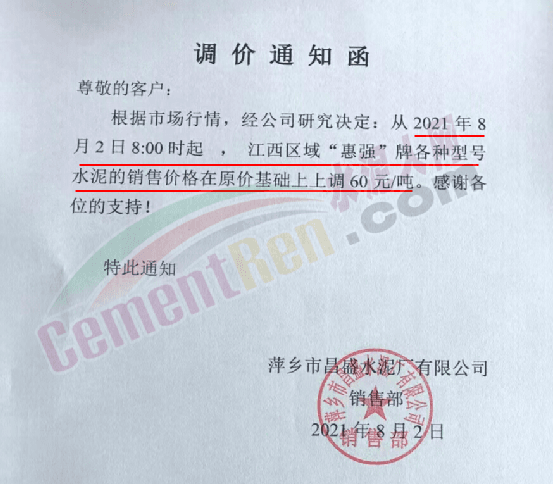 江西萍鄉(xiāng)市昌盛水泥廠有限公司通知,從8月2日8時起,江西區(qū)域“惠強(qiáng)”牌各標(biāo)號水泥在原價基礎(chǔ)上上調(diào)60元/噸。