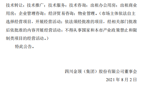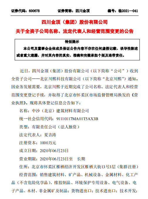 8月2日晚間公告:四川金頂(集團)股份有限公司(以下簡稱“公司”)收到全資子公司——北京川熙科技有限公司(以下簡稱“北京川熙”)通知。因業(yè)務(wù)發(fā)展需要,北京川熙于近期完成了公司名稱、法定代表人和經(jīng)營范圍變更登記手續(xù),并取得了北京市懷柔區(qū)市場監(jiān)督管理局換發(fā)的《營業(yè)執(zhí)照》。并將具體登記信息公告如下:
